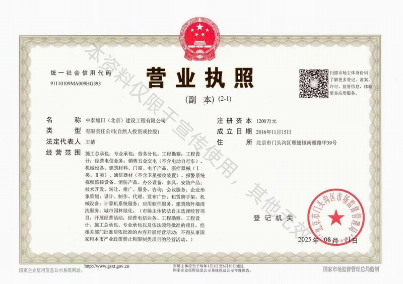 中泰旭日(北京)建设工程有限公司是集电子与智能化专业承包工程、建筑机电安装工程专业承包工程、消防设施工程专业承包工程、防水防腐保温工程承包工程、建筑幕墙工程专业承包工程、建筑装修装饰专业承包工程、钢结构专业承包工程、特种工程(结构补强)专业承包工程、环保专业承包工程、建筑施工总承包工程于一体的综合型建筑公司。公司注册资金1200万,通过了ISO9001(质量、环境、职业健康安全)管理体系认证。