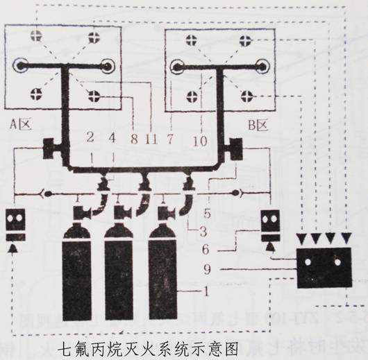 1七氟丙烷储瓶2汇流管3高压软管4单向阀5释放阀6启动装置7七氟丙烷喷头8火灾探测器9火灾报警及灭火控制设备10七氟丙烷输送管道11探测与控制线路
